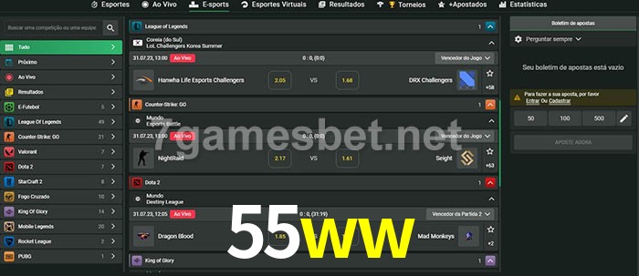 O 55ww oferece uma grande seleção de opções de apostas em e-sports com probabilidades competitivas